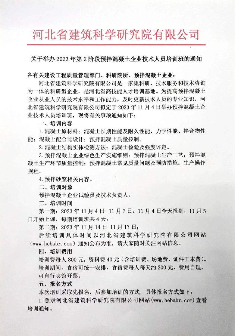 關(guān)于舉辦2023年第2階段預(yù)拌混凝土企業(yè)技術(shù)人員培訓(xùn)班的通知