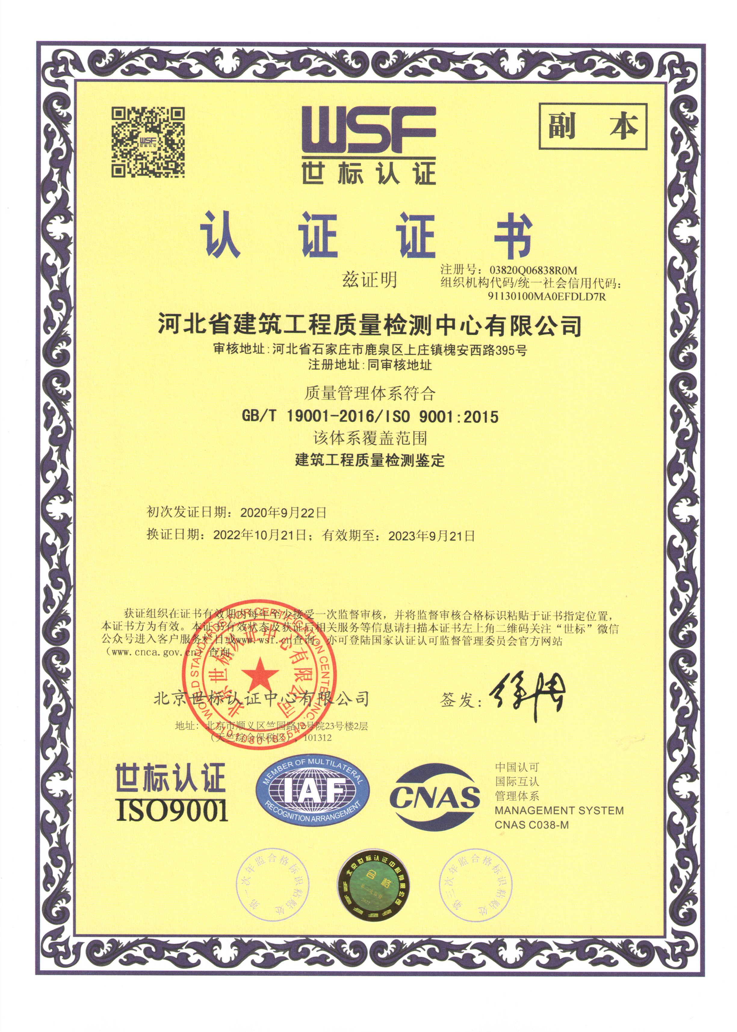 河北省建筑工程質(zhì)量檢測中心認證證書1